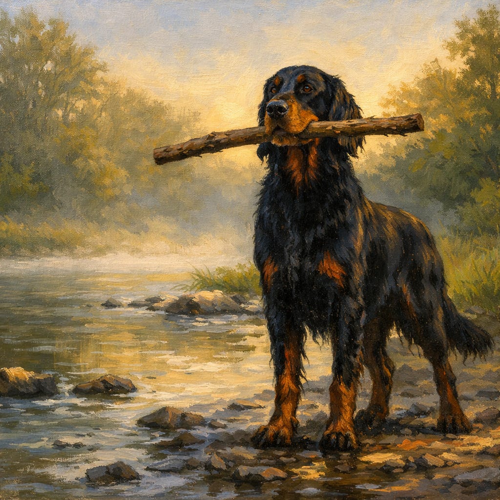 A spaniel nearby was deeply absorbed in the muddy riverside, entirely uninterested in global stick politics.